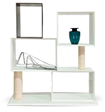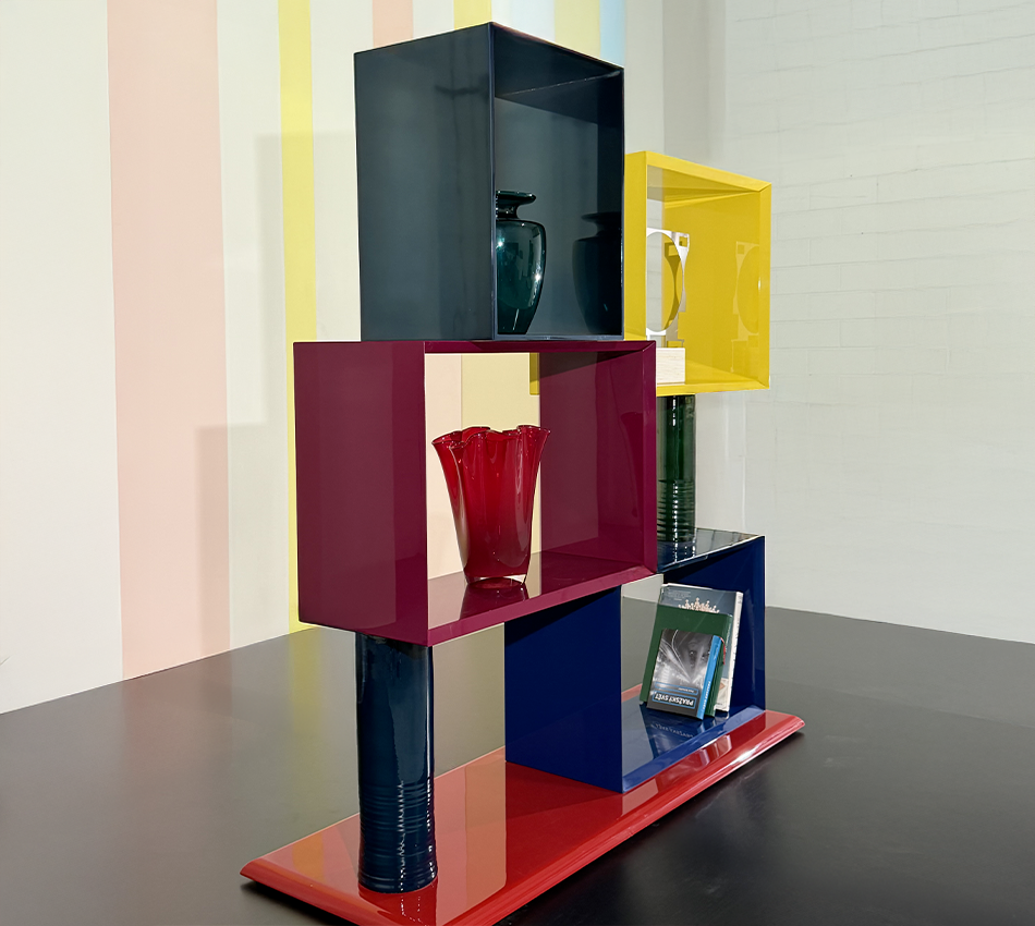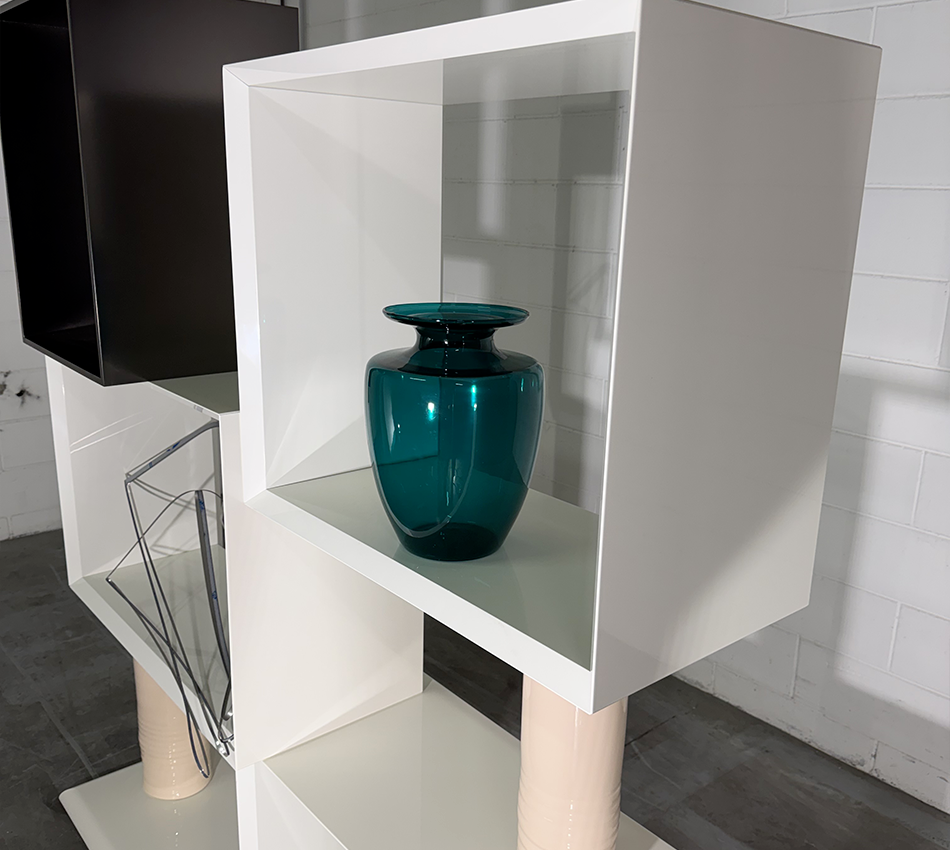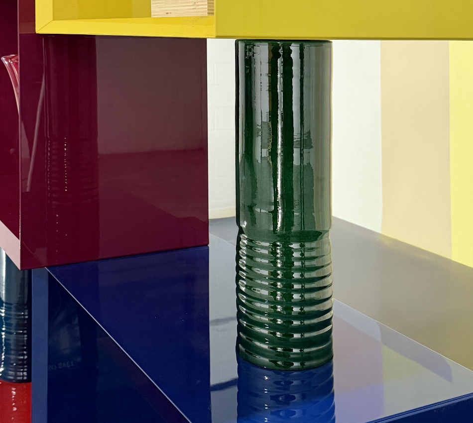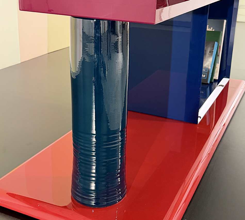 Finitura: laccato lucido, dettagli in alluminio verniciato. Sostegni in ceramica fatti e dipinti a mano.