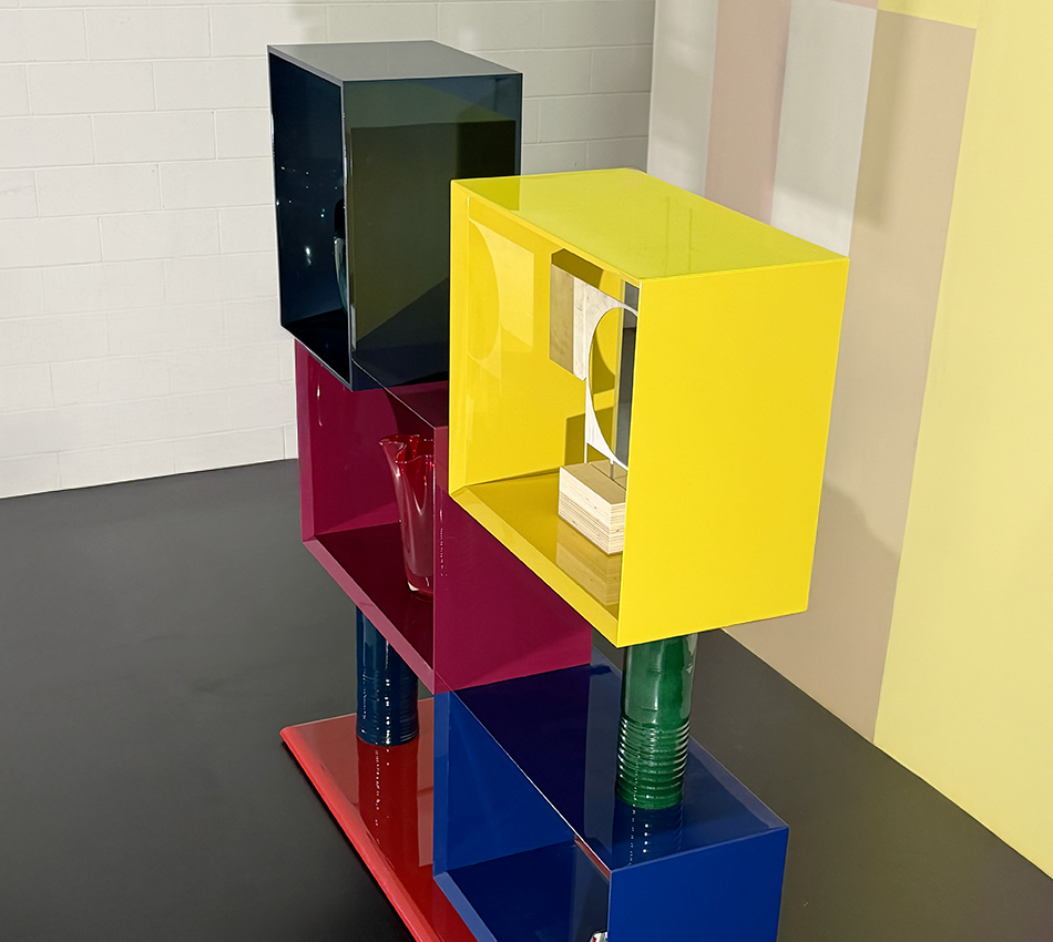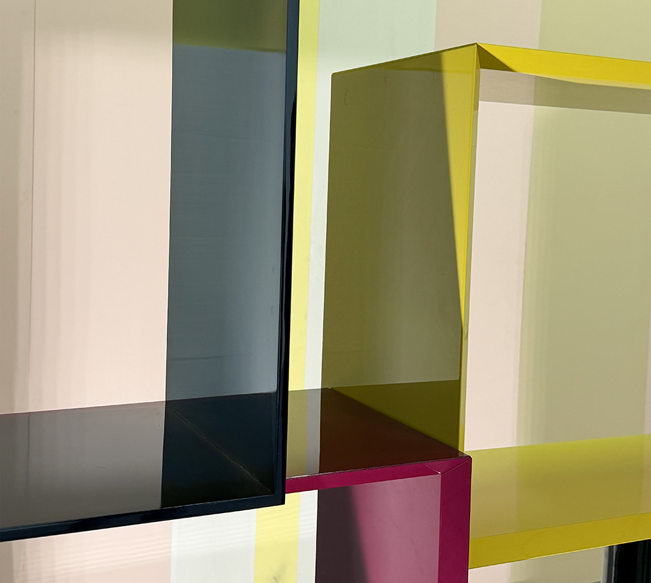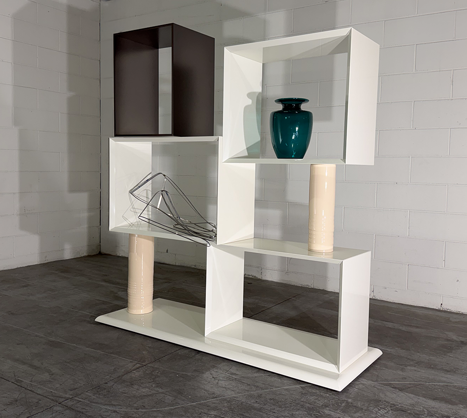 Armonia e rigore danno vita a un’estetica matematica e geometrica. Volumi e proporzioni definiti, la contemporaneità dell’alluminio, i sostegni in ceramica, fatti e dipinti a mano, rendono l’elemento un’installazione da vivere.